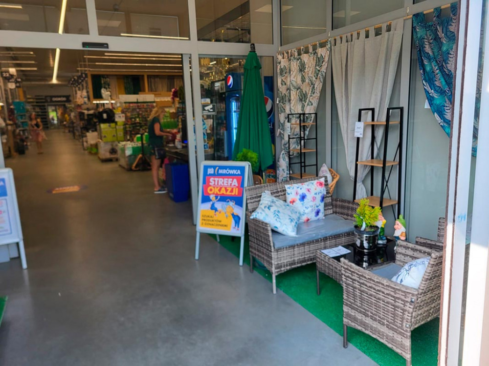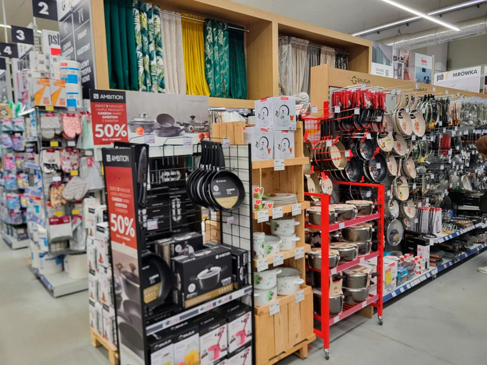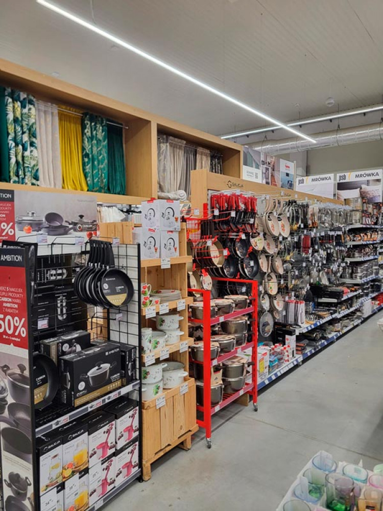 Klienci znajdą tu wszystko, czego potrzebują do budowy, remontu i wyposażenia domu oraz ogrodu – od narzędzi, materiałów budowlanych i hydraulicznych, przez farby, chemię budowlaną, aż po dekoracje, oświetlenie i artykuły sezonowe. Market wyróżnia się nowoczesnym wnętrzem, przejrzystym układem działów i regularnymi promocjami.